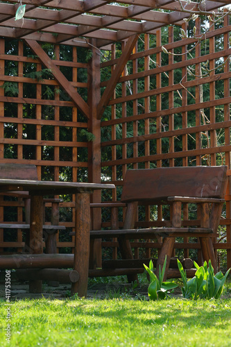 Obraz premium view from the ground level to the wooden gazebo with furniture