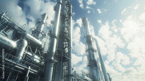© Studio Nova, Obraz premium view from the ground up of towering silver industrial distillation columns at a petrochemical plant with a sunlit blue sky in the background.