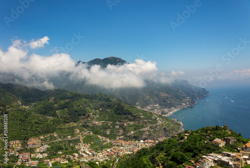 Fototapeta premium View from the hill of Ravello with mountain, clouds and sea coast of Amalfi,...