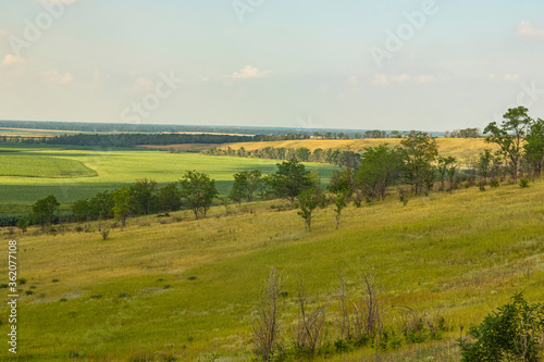 © Алексей Кравчук, Obraz premium View from the hill to the river and agricultural fields to the horizon and blue sky. Russia, Krasnodar Territory.
