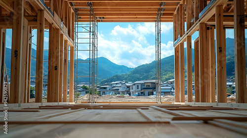 © Siasart Stock, Fototapeta premium View from the inside of a wooden frame house under construction, showing a blue sky, green hills and houses.