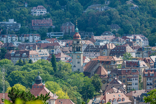 Fototapeta premium View from the Karlshöhe to the Markus Church in the south of the Stuttgart city. Baden-Württemberg, Germany, Europe