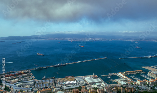 Obraz premium View from the Rock of Gibraltar to the bay of Gibraltar full of ships on the...