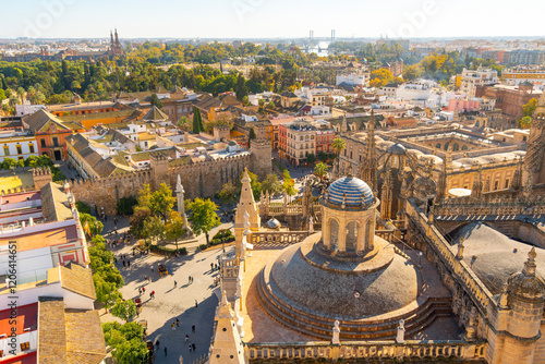 Fototapeta premium View from the rooftop of the Seville Cathedral of the historic Barrio Santa Cruz district, the Royal Alcazar and Plaza del Triunfo, in Seville, Spain.
