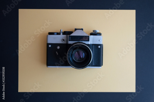 © diana777, Fototapeta premium View from the top on vintage film photo camera on the dark and yellow background. Metal silver and plastic black frame with lens