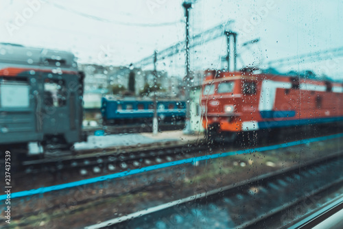 © johnalexandr, Fototapeta premium view from the train window in rainy weather.