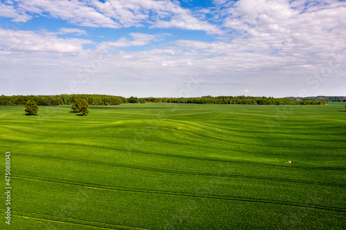 Obraz premium view from top to countryside with green agricultural fields, lonely trees and...