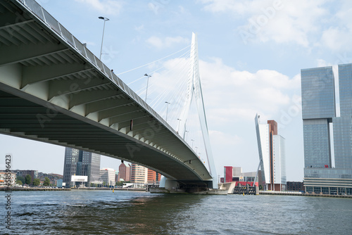 Obraz premium View from under Erasmus Bridge across New Meuse River to business district...
