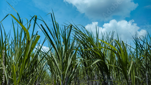 © IDNAF.std, Fototapeta premium View from Within a Dense Green Sugarcane Field Under Blue Sky