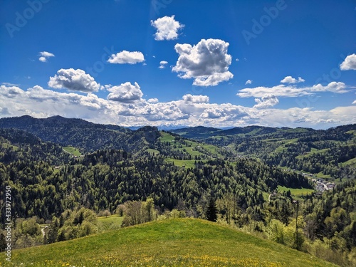 Fototapeta premium View in the Zurich Oberland of the surrounding hills in this beautiful spring season. foresight in the mountains. Steg
