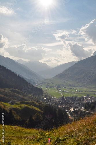© Jan, Naklejka premium View into a deep mountain valley with houses and roads directly against the sun - France