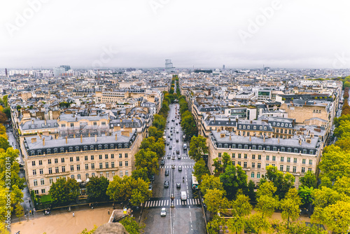 © George, Naklejka premium View looking over the city of Paris with cars driving near the Arc de Triomphe