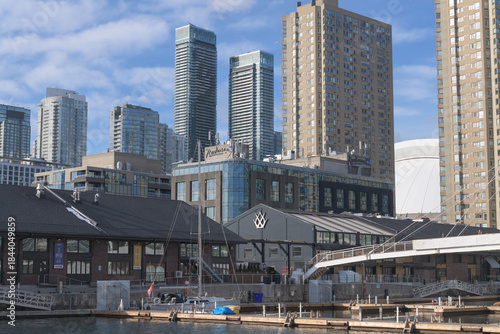 Naklejka premium view northwest to Queens Harbour and Radisson Blu incl condominium complexes and other offices from Harbourfront Centre, Toronto