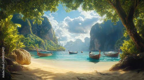© Sakibjaman777, Fototapeta premium View of a beach with boats and a mountain in the background.