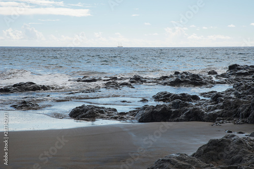 © Ana, Fototapeta premium View of a beautiful remote volcanic sand beach with tranquil waves hitting rocks and sand, on a cloudy day, after the storm, on the northern coast of the island of Tenerife, Canary Islands, Spain