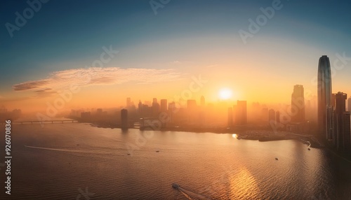 © CatNap Studio, Fototapeta premium View of a big city with many tall buildings at morning sunrise.