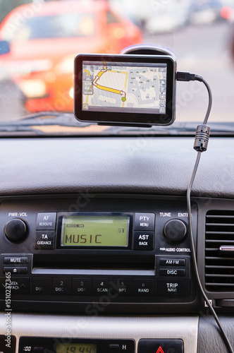© luengo_ua, Fototapeta premium View of a car's dashboard featuring a GPS device displaying a route and an audio player interface labeled 'music.' Modern driving technology and convenience emphasized.