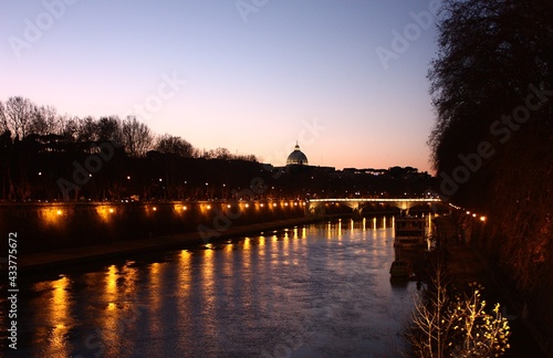 Naklejka premium view of a cathedral at sunset over a river in rome