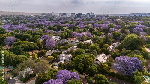 © Wirestock, Obraz premium View of a cityscape blanketed in vibrant purple hues of jacaranda blossoms in Johannesburg