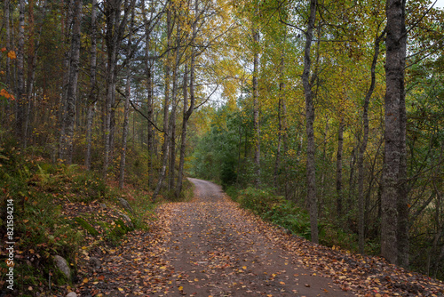 © Ula Ulachka, Fototapeta premium View of a country road through the autumn forest near the village of Lumivaara on a sunny autumn day, Ladoga Skerries, Lahdenpohya, Republic of Karelia, Russia