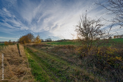 © Milan, Fototapeta premium View of a dirt road, November afternoon, slightly cloudy sky, yellow leaves on trees, November, low sun
