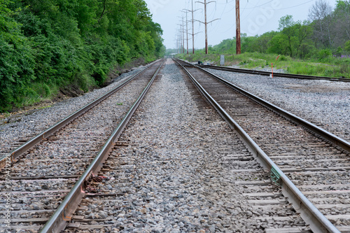 © bjphotographs, Naklejka premium View of a double steel railroad tracks with trees on the side of the road.