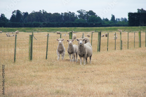 © NuFa Studio, Obraz premium View of a family sheep on a farm in South Island, New Zealand in summer morning