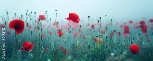 © diwek, Fototapeta premium View of a field of blooming red poppies during a mist