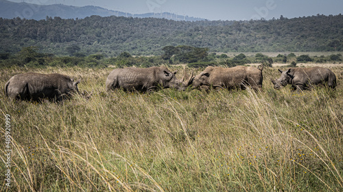 © schusterbauer.com, Naklejka premium View of a herd of white rhinos grazing in the savannah grasslands of the Nairobi National Park near Nairobi, Kenya
