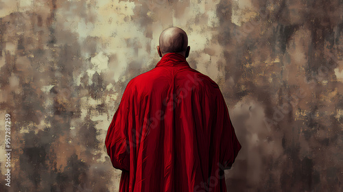 Naklejka premium View of a historical figure in a red robe from behind against a textured,...