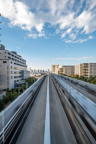 Fototapeta premium View of a modern city skyline from the head of a train in long exposition