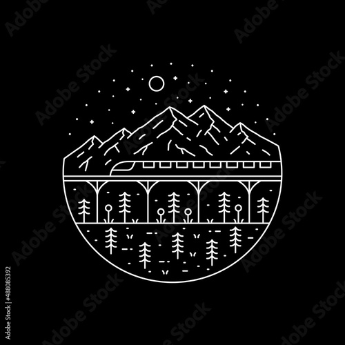 Fototapeta premium view of a train passing by in the background of a mountain and forest in mono line art