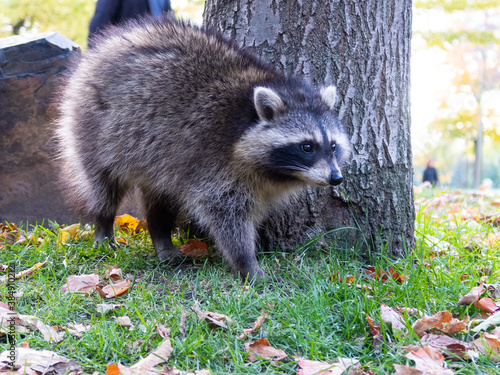 © jonas, Naklejka premium View of a wild north american raccoon standing on the grass in a park