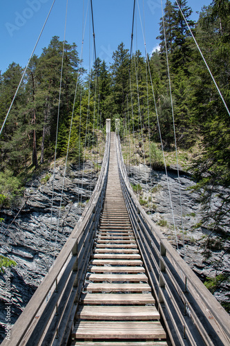 © 2199_de, Fototapeta premium View of a wild river in a gorge with a modern suspension bridge with the name Traversinersteg, in the Swiss Alps