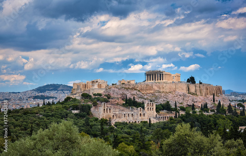 © NPershaj, Fototapeta premium View of Acropolis hill and theater of Odeon in Athens, Greece from the hill of Philoppapos or Muses in summer daylight with great clouds in blue sky.