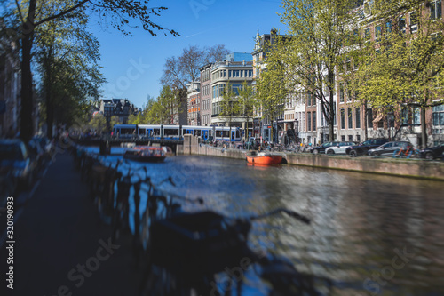 © tsuguliev, Obraz premium View of Amsterdam street in the historical center, with canal houses in the capital city of Amsterdam, North Holland, Netherlands, summer sunny day