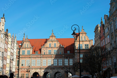 © B.inna, Fototapeta premium View of an ancient building with a red roof, windows and arches against a blue sky. Street lanterns and old buildings around. Central square. Old architecture. Cityscape. Poland, Gdansk, April 2023