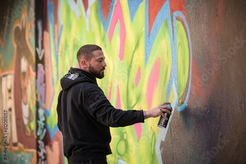 © AUFORT Jérome, Obraz premium view of an artist doing street art in Paris