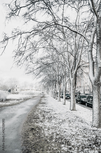 Obraz premium View of an avenue with trees in a cold snowy spring
