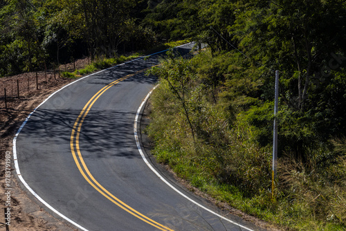 Fototapeta premium View of an empty paved rural road, flanked by Atlantic forest and eucalyptus fields in a mountain range in Brazil