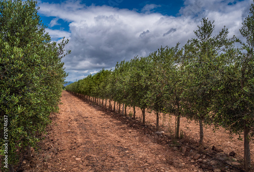 Naklejka premium View of an olive orchard in the foreground and clouds background