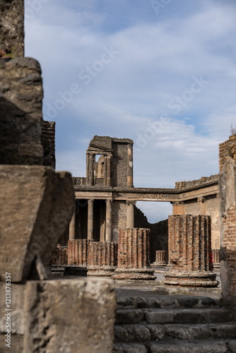 Naklejka premium View of ancient Roman city ruins street of Pompei, destroyed from eruption of Mount Vesuvius in 1st century.