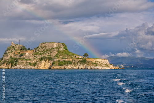 © elenakirey, Fototapeta premium View of ancient venetian fortress on the hill at Corfu Island, Greece. Old stone walls, covered with green grass, sea bay, blue sky and rainbow
