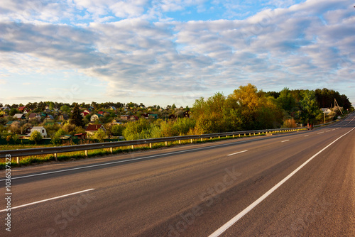 Fototapeta premium View of asphalt road with rural buildings in the background