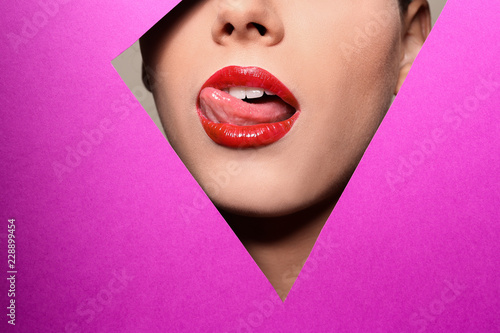 Obraz premium View of beautiful young woman with red lips through cutout in color paper,...