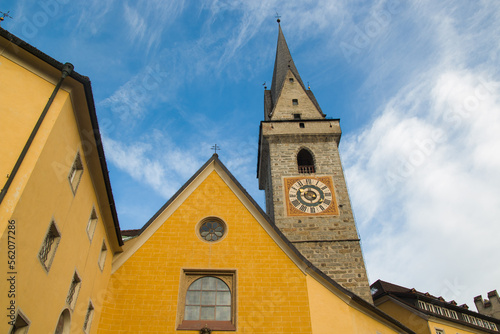 Obraz premium View of bell tower with clock in the historic center of Brunico town in Alto...
