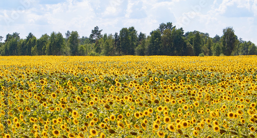 © Nata Studio, Fototapeta premium View of blooming field of sunflowers with trees in far over cloudy blue sky by summertime.