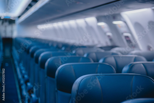 Fototapeta premium View of blurred empty passenger airplane seats in the cabin in blue colored, blurred of empty seat in the aircraft