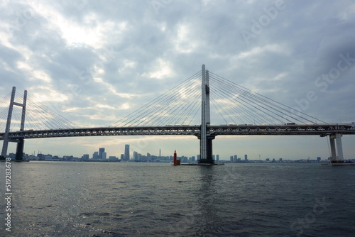 © Tatiana, Naklejka premium View of bridge against cloudy sky. Impressive Yokohama bay bridge over Tokyo Bay