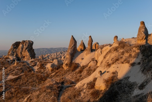 © Wirestock, Obraz premium View of Cappadocia's unique rock formations under a clear blue sky during sunset